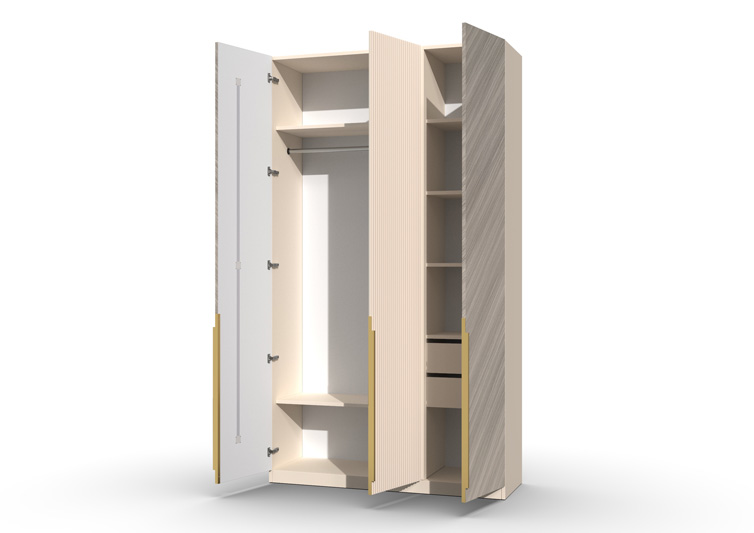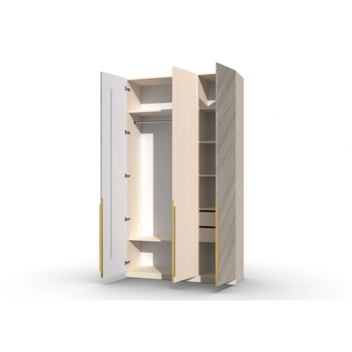 Шкаф 3-х створчатый Шале от фабрики Geona - это элегантное и практичное решение для хранения вещей в вашей спальне или гостиной. Он оснащен выдвижными ящиками и имеет эффектную отделку в диагональном направлении текстуры, что придает ему изысканный и стильный вид.