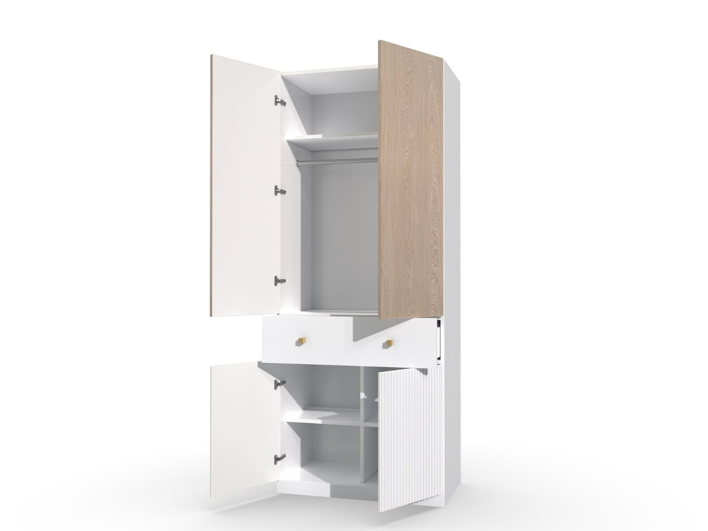 Шкаф "Темпо" предлагает вместительное пространство для хранения вашей одежды, аксессуаров и других предметов. Две створки шкафа обеспечивают удобный доступ к вещам и позволяют организовать их по категориям. Внутреннее пространство шкафа можно настроить с помощью полок, штанги для вешалок и других элементов, чтобы максимально удовлетворить ваши потребности в хранении.